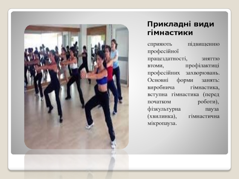 Основні форми занять: виробнича гімнастика, вступна гімнастика (перед початком роботи), фізкультурна пауза (хвилинка), гімнастична мікропауза.