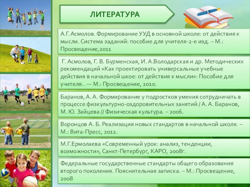 Г. Асмолов, Г. В. Бурменская, И. А.Володарская и др. Методических рекомендаций «Как проектировать универсальные учебные действия в начальной шкое: от действия к мысли»: Пособие для учителя.. — М.: Просвещение, 2010.