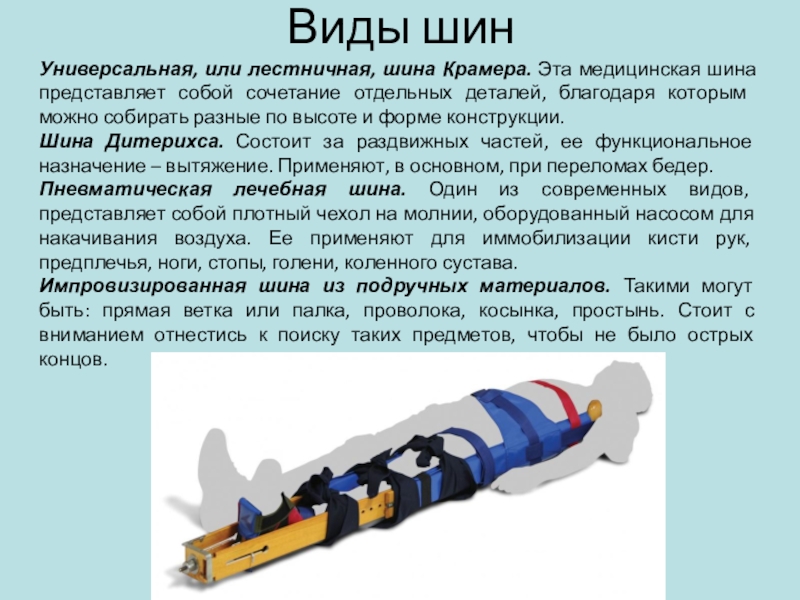 Универсальная, или лестничная, шина Крамера.Шина Дитерихса.Пневматическая лечебная шина.Импровизированная шина из подручных материалов.