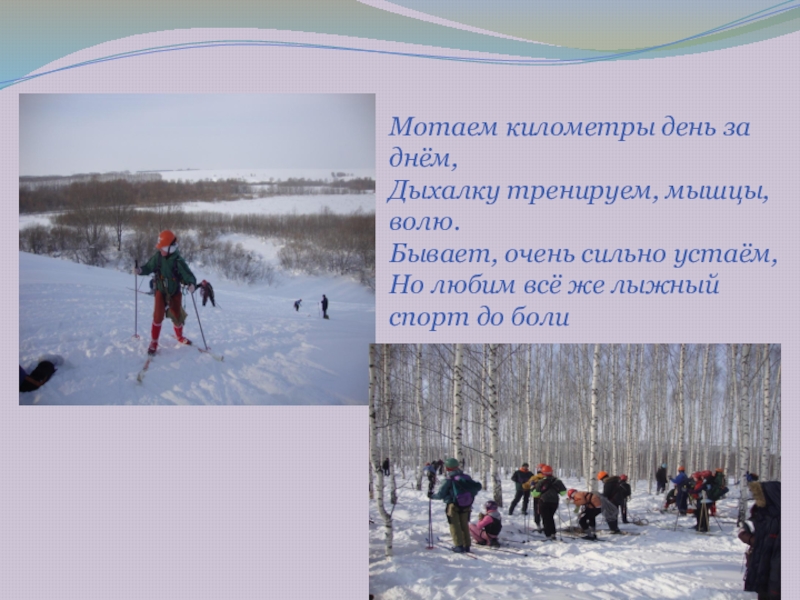 Слайд 7Мотаем километры день за днём, Дыхалку тренируем, мышцы, волю. Бывает, очень сильно устаём, Но