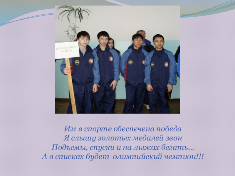 Им в спорте обеспечена победаЯ слышу золотых медалей звонПодъемы, спуски и на лыжах бегать…А в списках будет