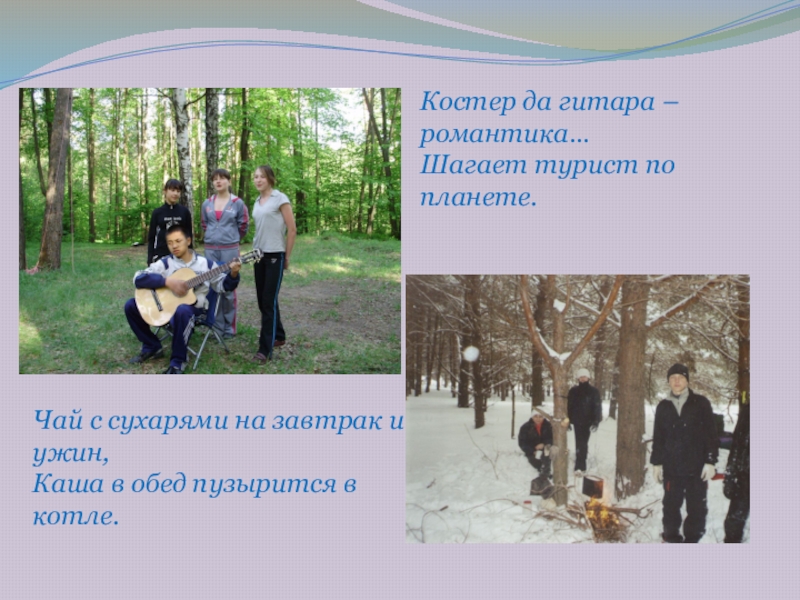 Слайд 9Костер да гитара – романтика… Шагает турист по планете.