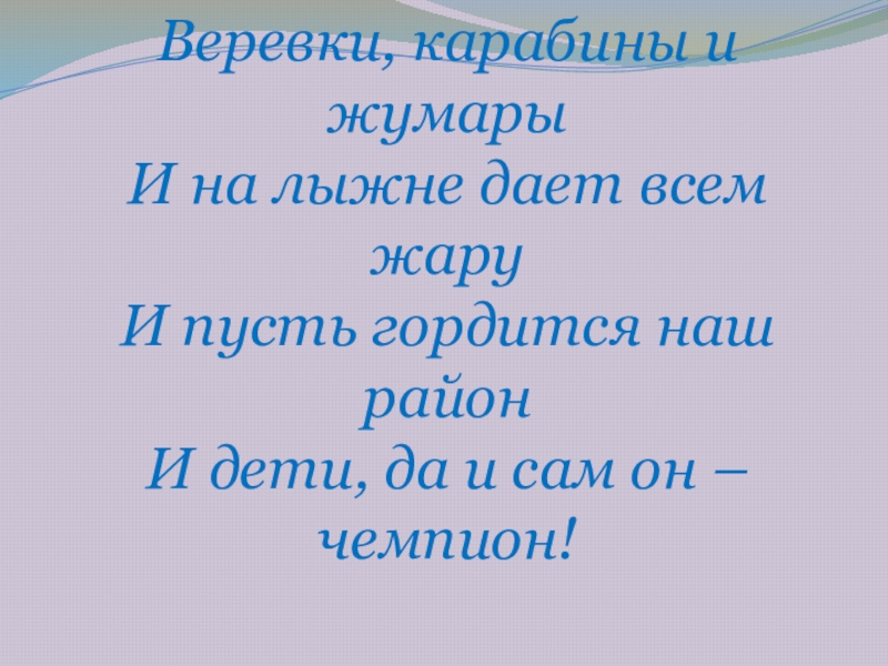 Веревки, карабины и жумарыИ на лыжне дает всем жаруИ пусть гордится наш районИ дети, да и сам он – чемпион!