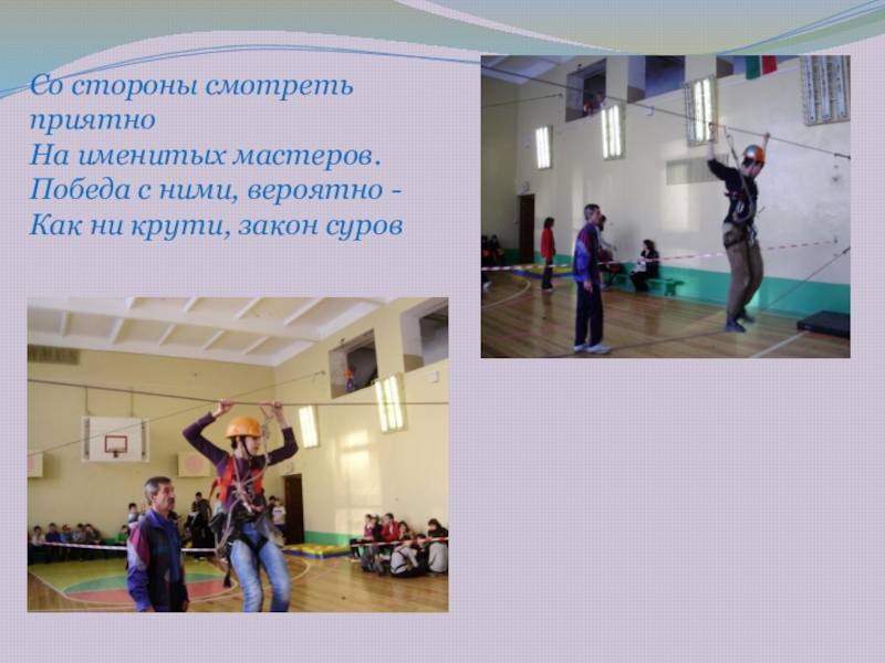 Веревки, карабины и жумарыИ на лыжне дает всем жаруИ пусть гордится наш районИ дети, да и сам