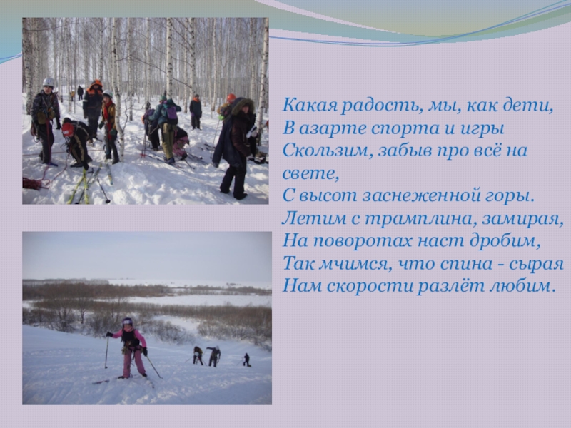 Какая радость, мы, как дети,  В азарте спорта и игры  Скользим, забыв про всё на