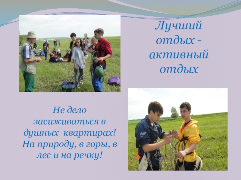 Лучший отдых - активный отдыхНе дело засиживаться в душных квартирах! На природу, в горы, в лес и