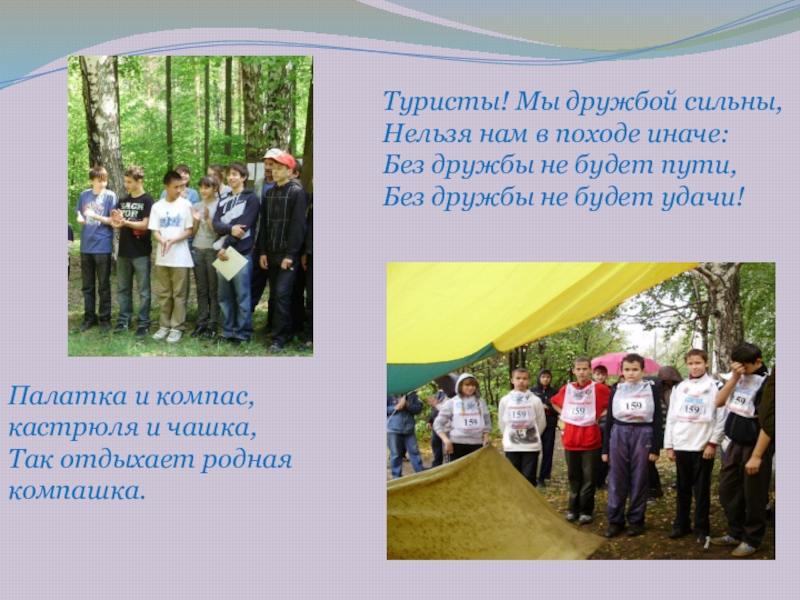 Палатка и компас, кастрюля и чашка, Так отдыхает родная компашка. Туристы! Мы дружбой сильны,Нельзя нам в походе