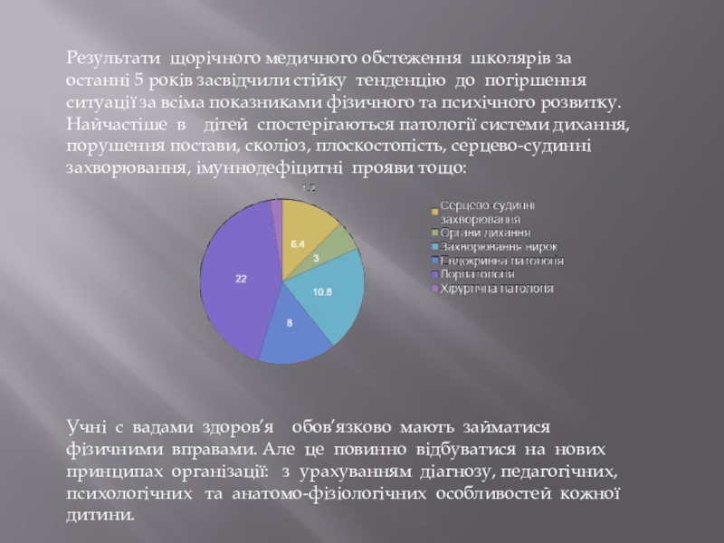 Результати щорічного медичного обстеження школярів за останні 5 років засвідчили стійку тенденцію до погіршення ситуації за всіма показниками фізичного та психічного розвитку. Найчастіше в дітей спостерігаються патології системи дихання, порушення постави, сколіоз, плоскостопість, серцево-судинні захворювання, імуннодефіцитні прояви тощо: