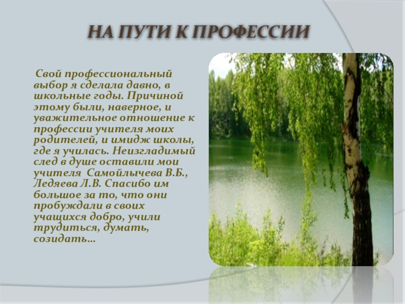 годы. Причиной этому были, наверное, и уважительное отношение к профессии учителя моих родителей, и имидж школы, где я училась. Неизгладимый след в душе оставили мои учителя Самойлычева В.Б., Ледяева Л.В. Спасибо им большое за то, что они пробуждали в своих учащихся добро, учили трудиться, думать, созидать…