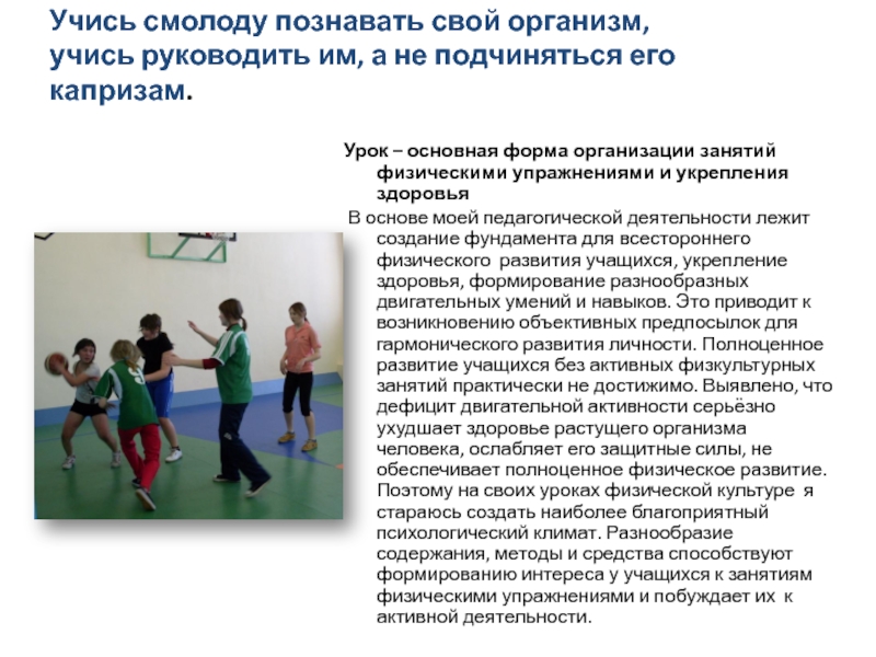 В основе моей педагогической деятельности лежит создание фундамента для всестороннего физического развития учащихся, укрепление здоровья, формирование разнообразных двигательных умений и навыков. Это приводит к возникновению объективных предпосылок для гармонического развития личности. Полноценное развитие учащихся без активных физкультурных занятий практически не достижимо. Выявлено, что дефицит двигательной активности серьёзно ухудшает здоровье растущего организма человека, ослабляет его защитные силы, не обеспечивает полноценное физическое развитие. Поэтому на своих уроках физической культуре я стараюсь создать наиболее благоприятный психологический климат. Разнообразие содержания, методы и средства способствуют формированию интереса у учащихся к занятиям физическими упражнениями и побуждает их к активной деятельности.