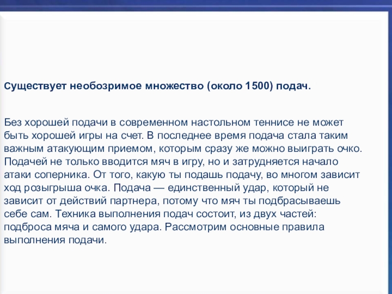 настольном теннисе не может быть хорошей игры на счет. В последнее время подача стала таким важным атакующим приемом, которым сразу же можно выиграть очко. Подачей не только вводится мяч в игру, но и затрудняется начало атаки соперника. От того, какую ты подашь подачу, во многом зависит ход розыгрыша очка. Подача — единственный удар, который не зависит от действий партнера, потому что мяч ты подбрасываешь себе сам. Техника выполнения подач состоит, из двух частей: подброса мяча и самого удара. Рассмотрим основные правила выполнения подачи.