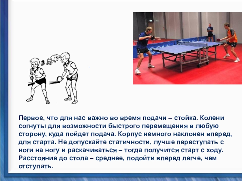 согнуты для возможности быстрого перемещения в любую сторону, куда пойдет подача. Корпус немного наклонен вперед, для старта. Не допускайте статичности, лучше переступать с ноги на ногу и раскачиваться – тогда получится старт с ходу. Расстояние до стола – среднее, подойти вперед легче, чем отступать.