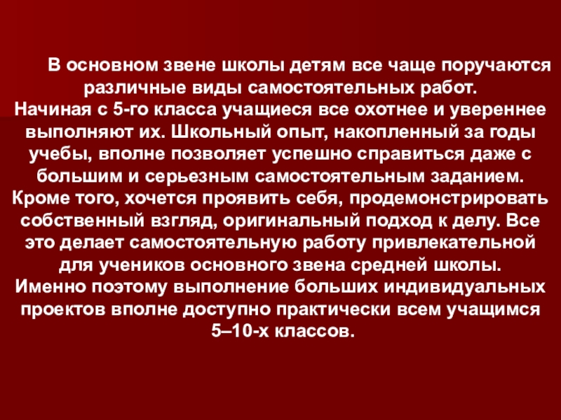 Кроме того, хочется проявить себя, продемонстрировать собственный взгляд, оригинальный подход к делу. Все это делает самостоятельную работу привлекательной