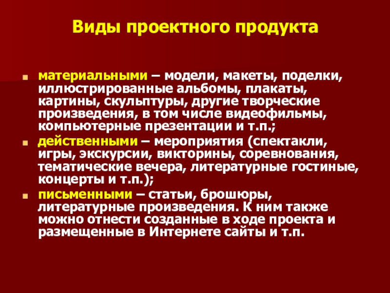 письменными – статьи, брошюры, литературные произведения. К ним также можно отнести созданные в ходе проекта и размещенные в Интернете сайты и т.п.