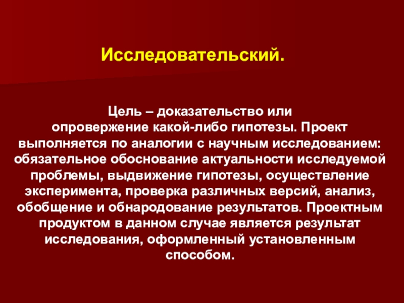 опровержение какой-либо гипотезы. Проект выполняется по аналогии с научным исследованием: обязательное обоснование актуальности исследуемой проблемы, выдвижение гипотезы, осуществление эксперимента, проверка различных версий, анализ, обобщение и обнародование результатов. Проектным продуктом в данном случае является результат исследования, оформленный установленным способом.