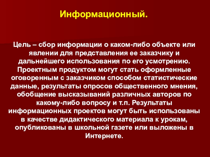 Цель – сбор информации о каком-либо объекте или явлении для представления ее заказчику и дальнейшего использования по его усмотрению. Проектным продуктом могут стать оформленные оговоренным с заказчиком способом статистические данные, результаты опросов общественного мнения, обобщение высказываний различных авторов по какому-либо вопросу и т.п. Результаты информационных проектов могут быть использованы в качестве дидактического материала к урокам, опубликованы в школьной газете или выложены в Интернете.