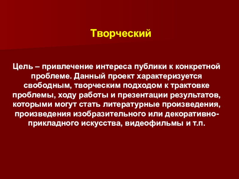 Цель – привлечение интереса публики к конкретной проблеме. Данный проект характеризуется свободным, творческим подходом к трактовке проблемы, ходу работы и презентации результатов, которыми могут стать литературные произведения, произведения изобразительного или декоративно-прикладного искусства, видеофильмы и т.п.