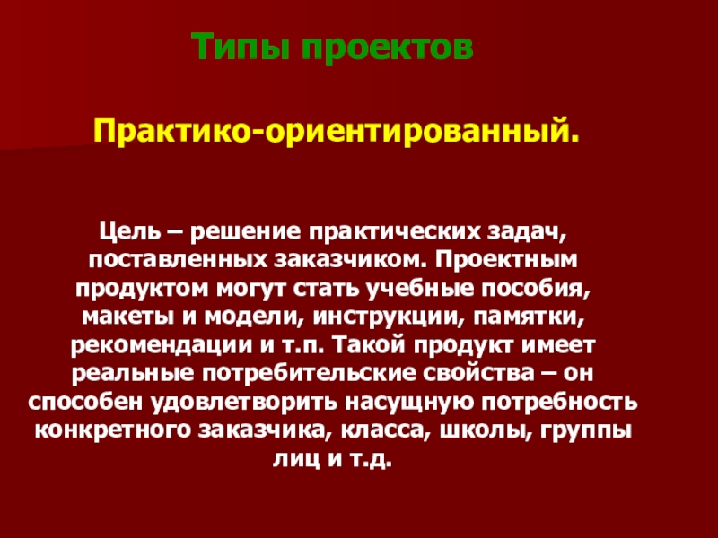 Цель – решение практических задач, поставленных заказчиком. Проектным продуктом могут