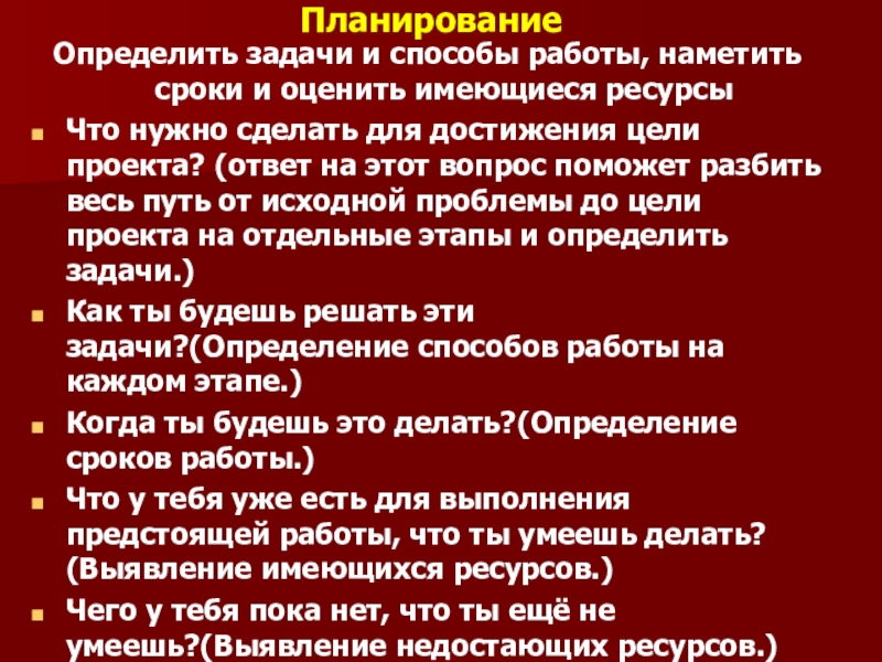 Определить задачи и способы работы, наметить сроки и оценить имеющиеся ресурсы