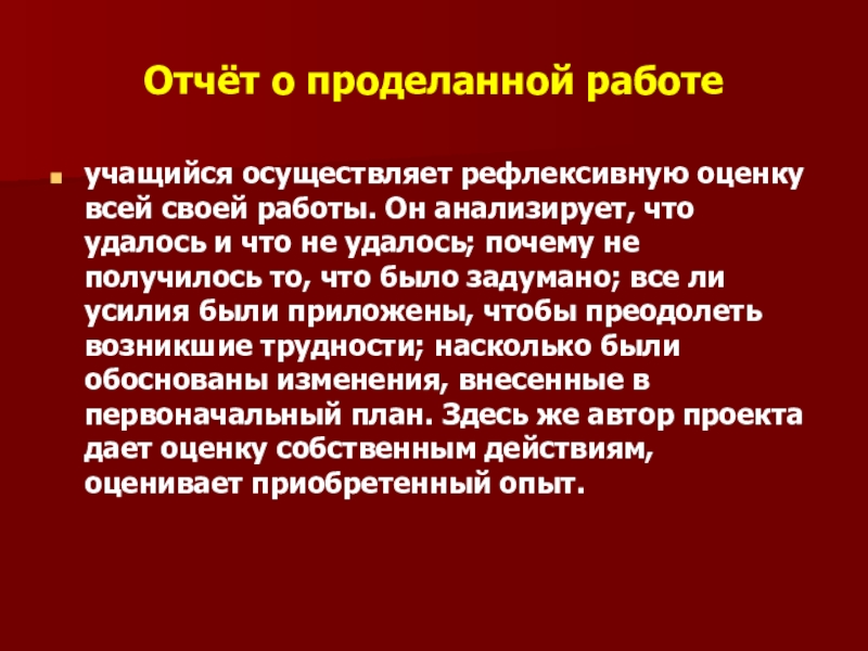анализирует, что удалось и что не удалось; почему не получилось то, что было задумано; все ли усилия были приложены, чтобы преодолеть возникшие трудности; насколько были обоснованы изменения, внесенные в первоначальный план. Здесь же автор проекта дает оценку собственным действиям, оценивает приобретенный опыт.