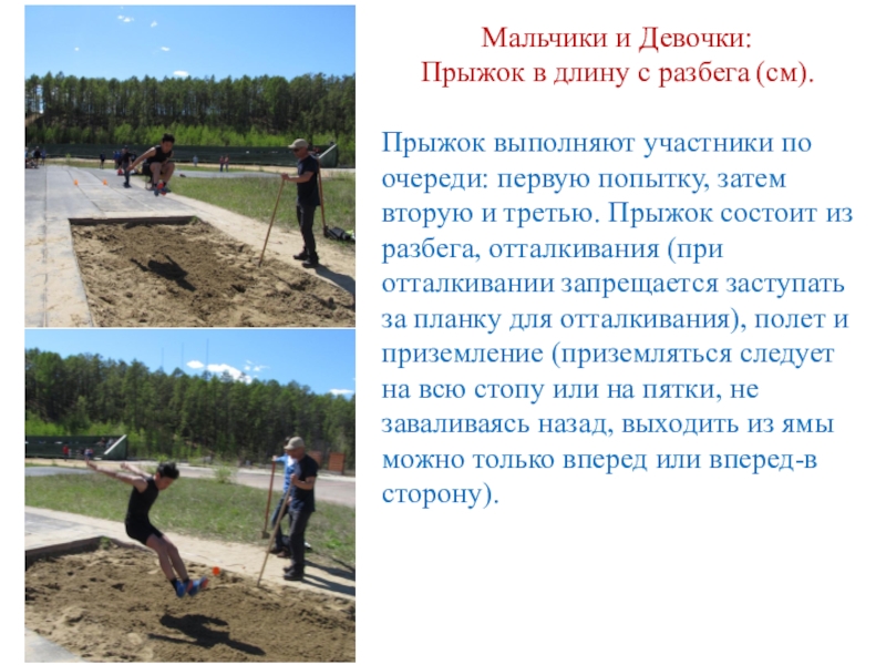 по очереди: первую попытку, затем вторую и третью. Прыжок состоит из разбега, отталкивания (при отталкивании запрещается заступать за планку для отталкивания), полет и приземление (приземляться следует на всю стопу или на пятки, не заваливаясь назад, выходить из ямы можно только вперед или вперед-в сторону).