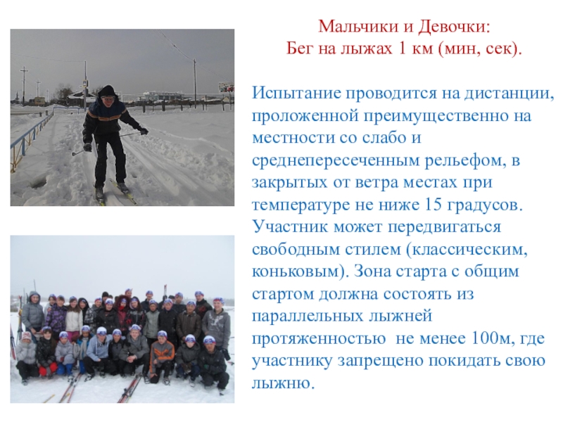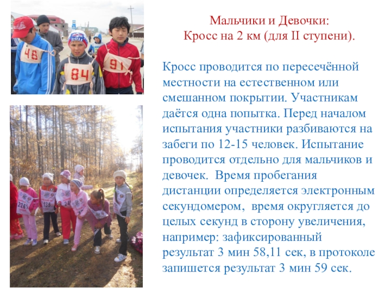 по пересечённой местности на естественном или смешанном покрытии. Участникам даётся одна попытка. Перед началом испытания участники разбиваются на забеги по 12-15 человек. Испытание проводится отдельно для мальчиков и девочек. Время пробегания дистанции определяется электронным секундомером, время округляется до целых секунд в сторону увеличения, например: зафиксированный результат 3 мин 58,11 сек, в протоколе запишется результат 3 мин 59 сек.