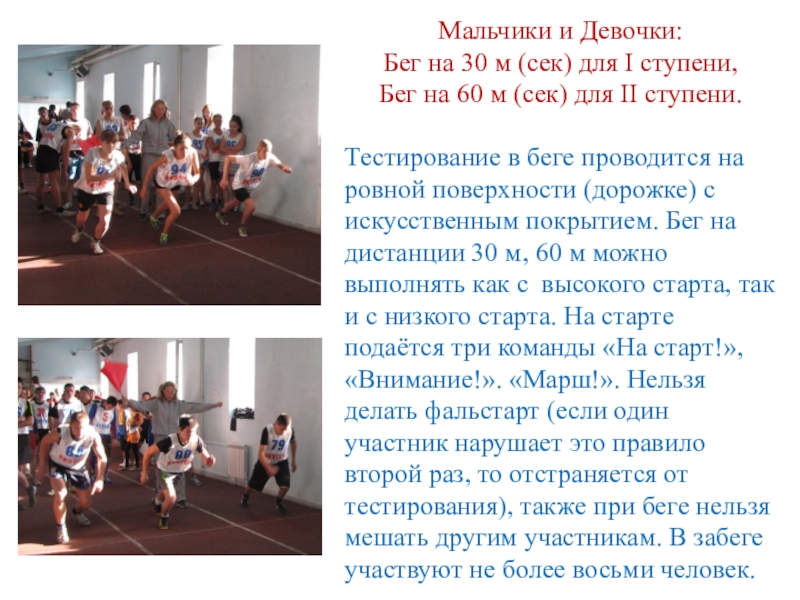 Тестирование в беге проводится на ровной поверхности (дорожке) с искусственным покрытием. Бег на дистанции 30 м, 60 м можно выполнять как с высокого старта, так и с низкого старта. На старте подаётся три команды «На старт!», «Внимание!». «Марш!». Нельзя делать фальстарт (если один участник нарушает это правило второй раз, то отстраняется от тестирования), также при беге нельзя мешать другим участникам. В забеге участвуют не более восьми человек.