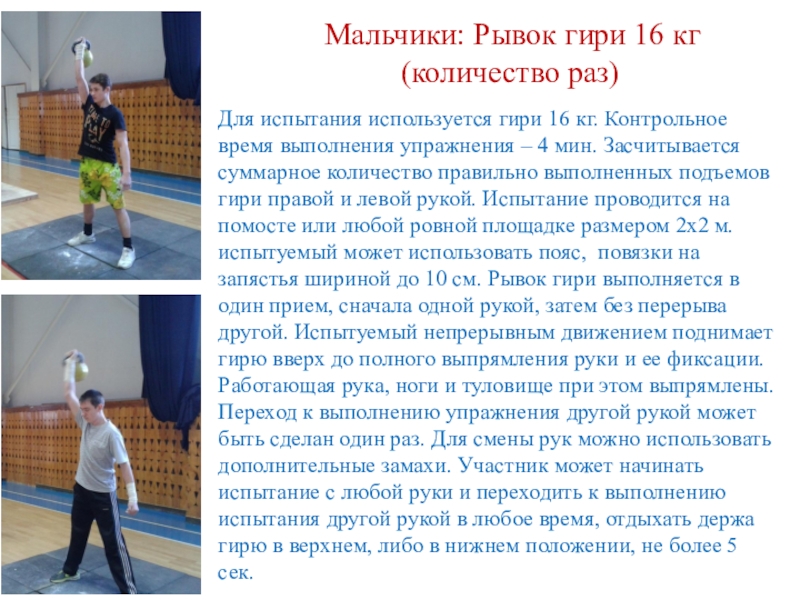 16 кг. Контрольное время выполнения упражнения – 4 мин. Засчитывается суммарное количество правильно выполненных подъемов гири правой и левой рукой. Испытание проводится на помосте или любой ровной площадке размером 2х2 м. испытуемый может использовать пояс, повязки на запястья шириной до 10 см. Рывок гири выполняется в один прием, сначала одной рукой, затем без перерыва другой. Испытуемый непрерывным движением поднимает гирю вверх до полного выпрямления руки и ее фиксации. Работающая рука, ноги и туловище при этом выпрямлены. Переход к выполнению упражнения другой рукой может быть сделан один раз. Для смены рук можно использовать дополнительные замахи. Участник может начинать испытание с любой руки и переходить к выполнению испытания другой рукой в любое время, отдыхать держа гирю в верхнем, либо в нижнем положении, не более 5 сек.