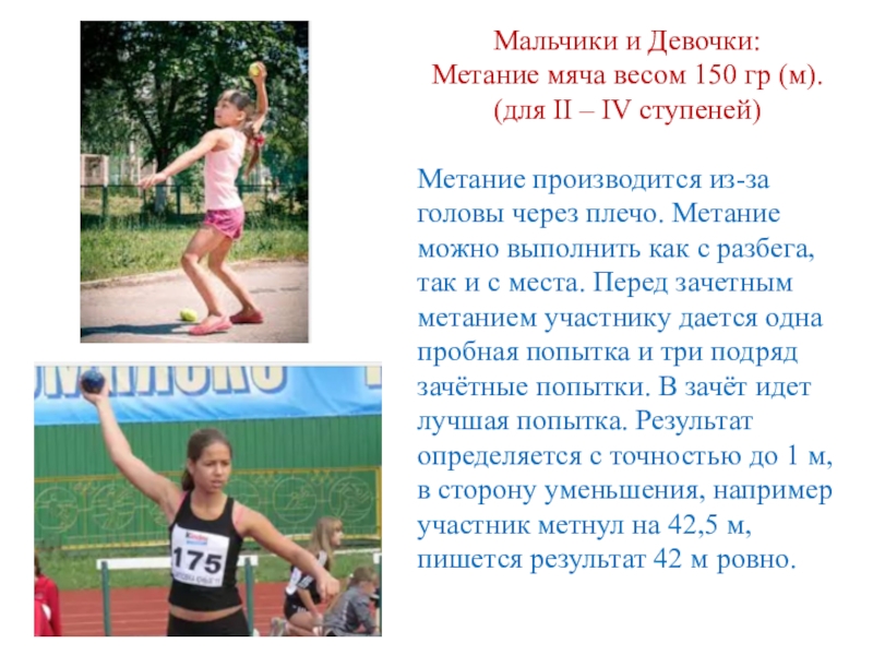 Метание производится из-за головы через плечо. Метание можно выполнить как с разбега, так и с места. Перед зачетным метанием участнику дается одна пробная попытка и три подряд зачётные попытки. В зачёт идет лучшая попытка. Результат определяется с точностью до 1 м, в сторону уменьшения, например участник метнул на 42,5 м, пишется результат 42 м ровно.