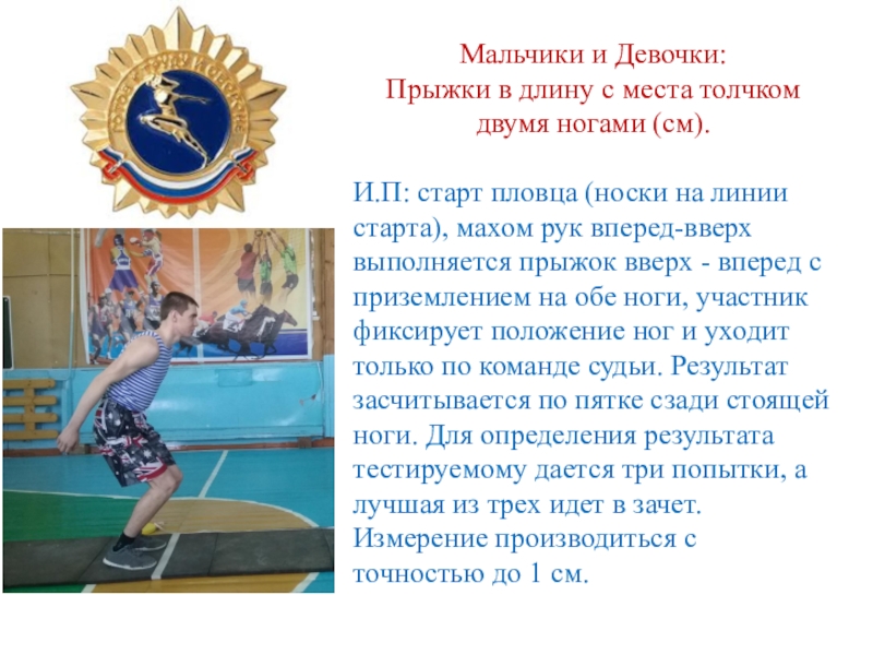 И.П: старт пловца (носки на линии старта), махом рук вперед-вверх выполняется прыжок вверх - вперед с приземлением на обе ноги, участник фиксирует положение ног и уходит только по команде судьи. Результат засчитывается по пятке сзади стоящей ноги. Для определения результата тестируемому дается три попытки, а лучшая из трех идет в зачет. Измерение производиться с точностью до 1 см.