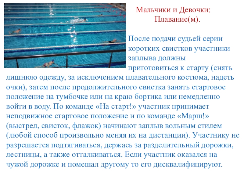 лишнюю одежду, за исключением плавательного костюма, надеть очки), затем после продолжительного свистка занять стартовое положение на тумбочке или на краю бортика или немедленно войти в воду. По команде «На старт!» участник принимает неподвижное стартовое положение и по команде «Марш!» (выстрел, свисток, флажок) начинают заплыв вольным стилем (любой способ произвольно меняя их на дистанции). Участнику не разрешается подтягиваться, держась за разделительный дорожки, лестницы, а также отталкиваться. Если участник оказался на чужой дорожке и помешал другому то его дисквалифицируют.