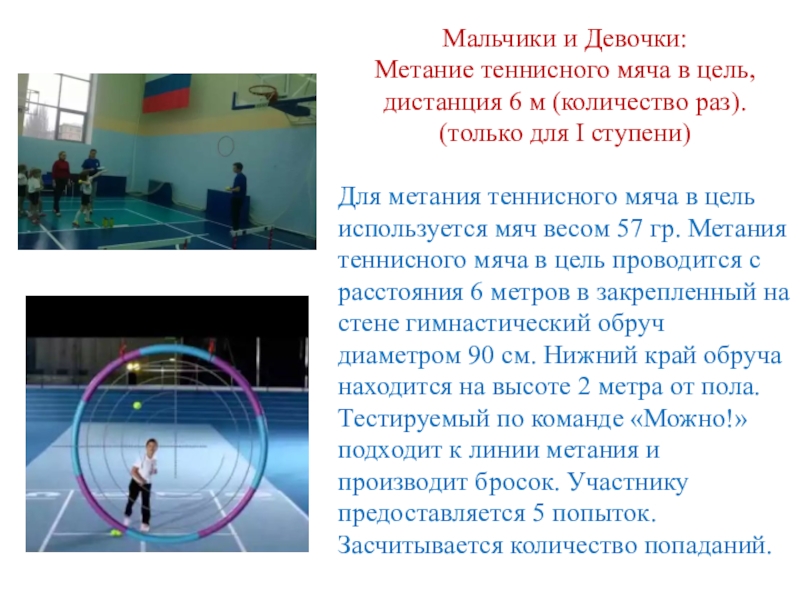 Для метания теннисного мяча в цель используется мяч весом 57 гр. Метания теннисного мяча в цель проводится с расстояния 6 метров в закрепленный на стене гимнастический обруч диаметром 90 см. Нижний край обруча находится на высоте 2 метра от пола. Тестируемый по команде «Можно!» подходит к линии метания и производит бросок. Участнику предоставляется 5 попыток. Засчитывается количество попаданий.