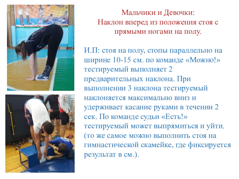 И.П: стоя на полу, стопы параллельно на ширине 10-15 см. по команде «Можно!» тестируемый выполняет 2 предварительных наклона. При выполнении 3 наклона тестируемый наклоняется максимально вниз и удерживает касание руками в течении 2 сек. По команде судьи «Есть!» тестируемый может выпрямиться и уйти. (то же самое можно выполнить стоя на гимнастической скамейке, где фиксируется результат в см.).