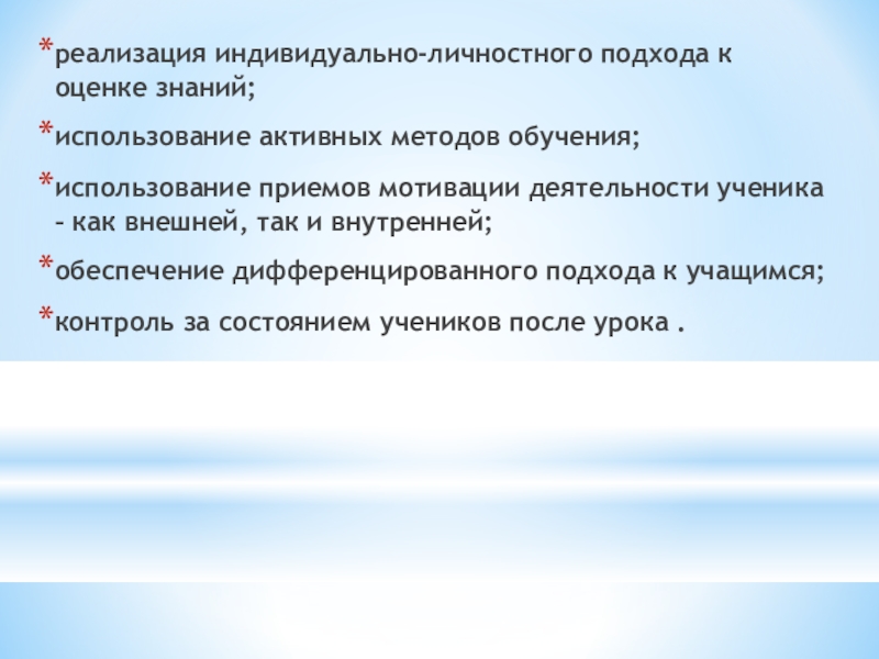реализация индивидуально-личностного подхода к оценке знаний;использование активных методов обучения;использование приемов мотивации деятельности ученика – как внешней, так