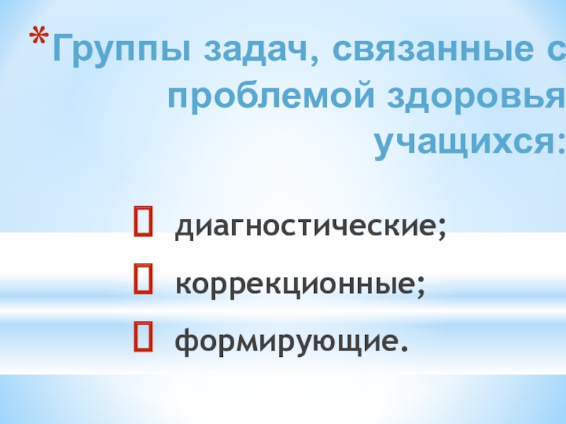 Группы задач, связанные с проблемой здоровья учащихся: диагностические; коррекционные; формирующие.