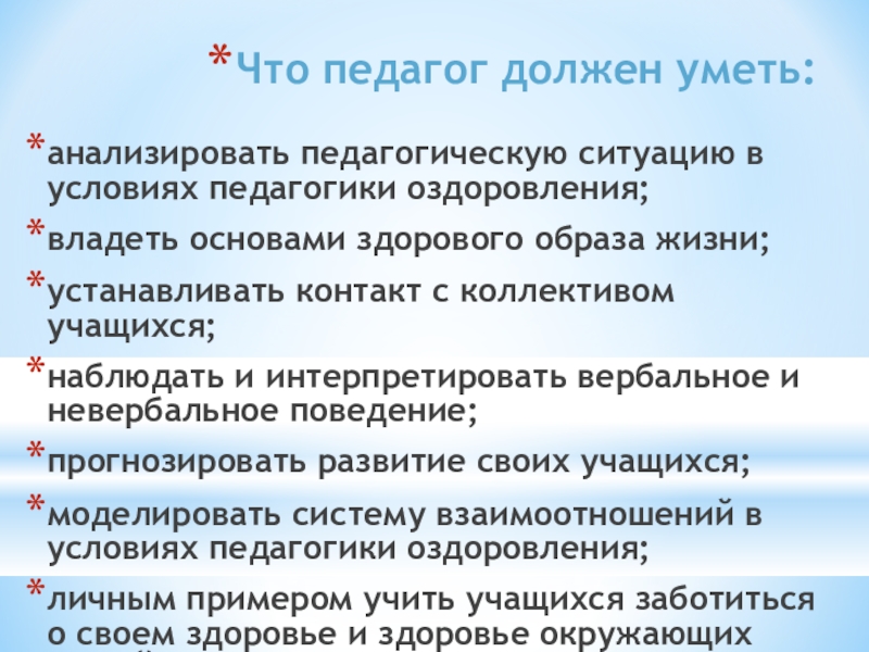 Что педагог должен уметь:анализировать педагогическую ситуацию в условиях педагогики оздоровления;владеть основами здорового образа жизни;устанавливать контакт с коллективом