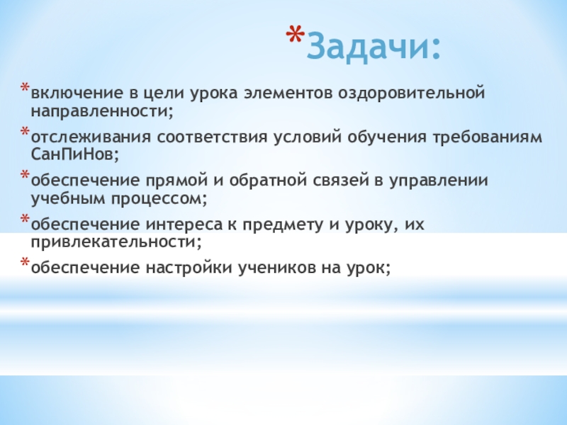 Задачи:включение в цели урока элементов оздоровительной направленности;отслеживания соответствия условий обучения требованиям СанПиНов;обеспечение прямой и обратной связей в