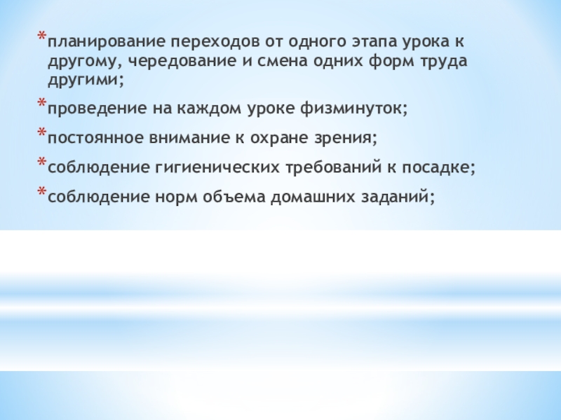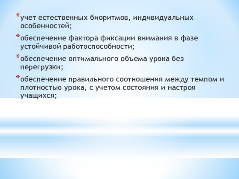 учет естественных биоритмов, индивидуальных особенностей;обеспечение фактора фиксации внимания в фазе устойчивой работоспособности;обеспечение оптимального объема урока без перегрузки;обеспечение