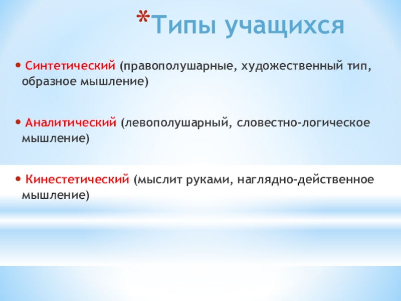 Типы учащихся Синтетический (правополушарные, художественный тип, образное мышление) Аналитический (левополушарный, словестно-логическое мышление) Кинестетический (мыслит руками, наглядно-действенное мышление)