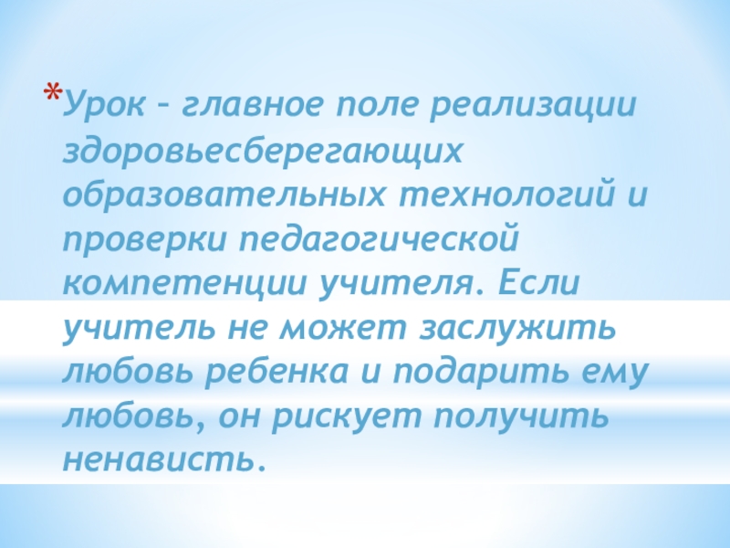 Урок – главное поле реализации здоровьесберегающих образовательных технологий и проверки педагогической компетенции учителя. Если учитель не может