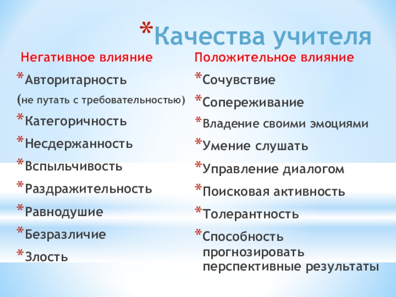 Качества учителя Негативное влияниеАвторитарность(не путать с требовательностью)КатегоричностьНесдержанностьВспыльчивостьРаздражительностьРавнодушие БезразличиеЗлостьПоложительное влияниеСочувствиеСопереживаниеВладение своими эмоциямиУмение слушатьУправление диалогомПоисковая активностьТолерантностьСпособность прогнозировать перспективные результаты