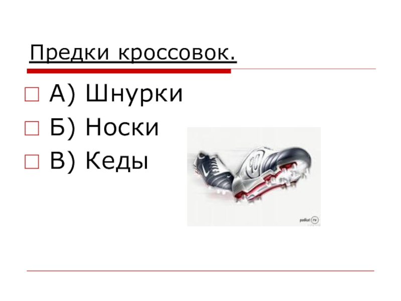 Предки кроссовок. А) ШнуркиБ) НоскиВ) Кеды