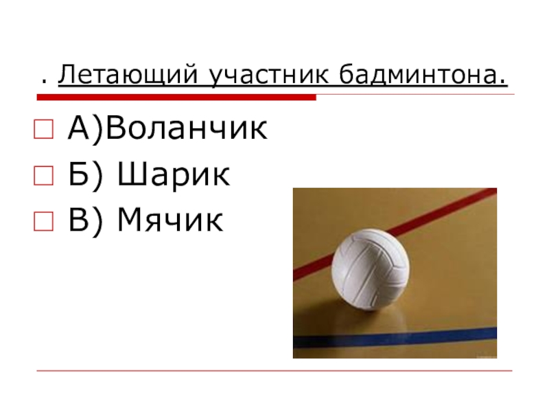 . Летающий участник бадминтона. А)ВоланчикБ) ШарикВ) Мячик