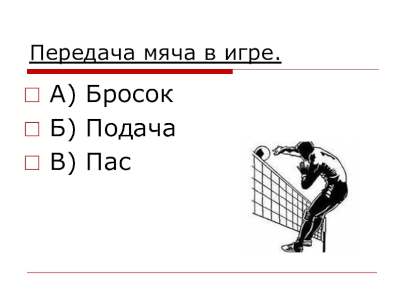 Передача мяча в игре. А) БросокБ) Подача В) Пас