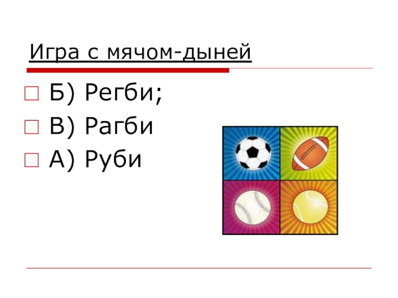 Игра с мячом-дыней Б) Регби;В) РагбиА) Руби