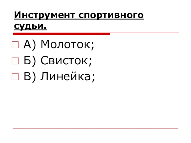 Инструмент спортивного судьи. А) Молоток;Б) Свисток;В) Линейка;