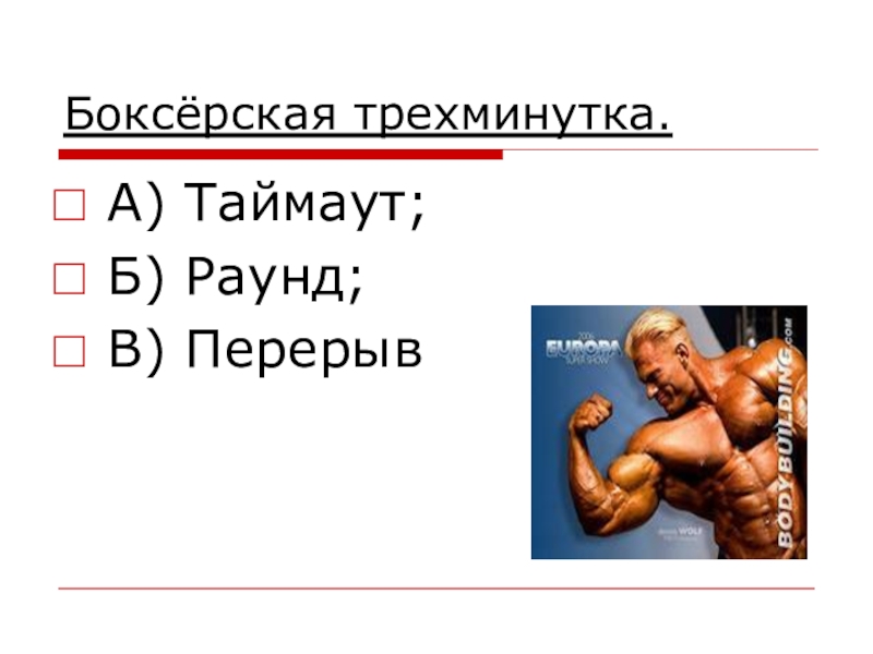 Боксёрская трехминутка.А) Таймаут;Б) Раунд;В) Перерыв