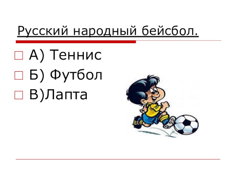 Русский народный бейсбол. А) Теннис	Б) ФутболВ)Лапта