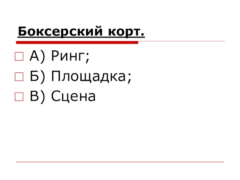 Боксерский корт. А) Ринг;Б) Площадка;В) Сцена