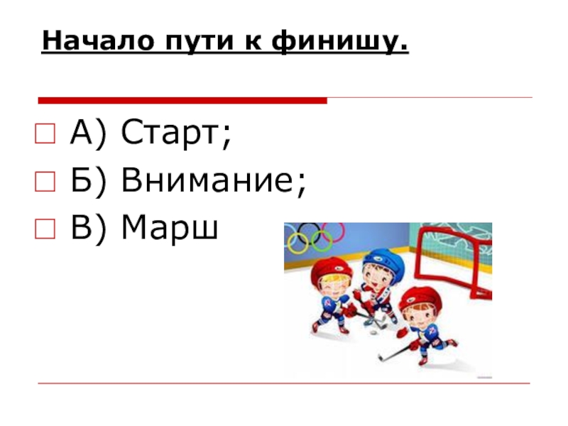 Начало пути к финишу. А) Старт;Б) Внимание;В) Марш